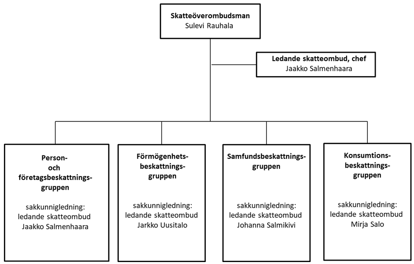 Enheten för bevakning av skattetagarnas rätt består av en skatteöverombudsman, ledande skatteombud och skatteombud. Inom rättsbevakningsenheten finns fyra verksamhetsgrupper: person- och företagsbeskattningsgruppen, förmögenhetsbeskattningsgruppen, samfundsbeskattningsgruppen och konsumtionsbeskattningsgruppen. Dessutom är grupperna indelade i mindre specialgrupper utgående från skatteslag. Enhetens organisationsschema 1.10.2019 finns som bilaga.