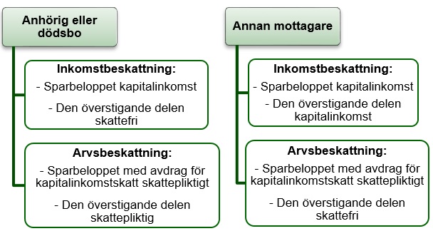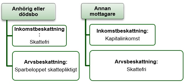 Försäkringsersättning som överstiger sparbeloppet utgör skattepliktig inkomst i arvsbeskattningen för dödsboet och de nära anhöriga som avses i ISkL 34 § 3 mom. För andra mottagare är ersättningen skattefri i arvsbeskattningen, eftersom den i inkomstbeskattningen utgör skattepliktig kapitalinkomst. För den del av ersättningen som överstiger sparbeloppet har det inte någon betydelse huruvida försäkringen har tecknats före eller efter 18.9.2009.