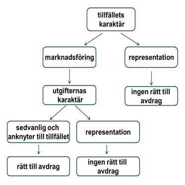 Om det handlar om ett marknadsföringstillfälle eller ett annat motsvarande tillfälle som enbart hänför sig till affärsverksamheten, ska man därtill granska utgifternas karaktär. I så fall ska man granska om utgifterna har en direkt koppling till tillfället, varvid de är avdragsgilla, eller om det handlar om representationsutgifter, varvid de inte är avdragsgilla. Deltagarna i tillfället spelar också en roll.