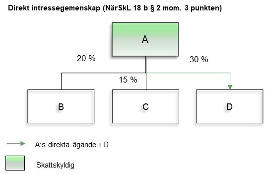Exempel 1: A äger direkt 20 procent av B, 15 procent av C och 30 procent av D. A är inte ett fristående företag enligt NärSkL 18 b § 2 mom. 3 punkten, eftersom det direkt äger 30 procent av D.