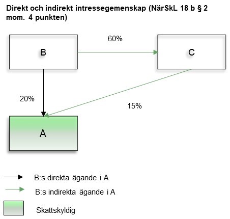 Exempel 3: B äger direkt 20 procent av A och 60 procent av C, som äger 15 procent av A. Varken B eller C äger direkt 25 procent eller mer av A. A är inte ett fristående företag enligt NärSkL 18 b § 2 mom. 4 punkten, eftersom B direkt eller indirekt äger 29 procent av A. B kan också vara en fysisk person.
