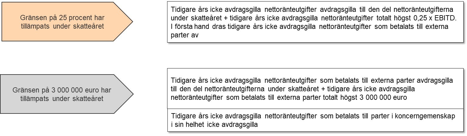 De icke avdragsgilla nettoränteutgifterna från tidigare skatteår kan till att börja med dras av till ett belopp som motsvarar nettoränteinkomsterna under skatteåret, så att nettoränteutgifterna som betalats till externa parter dras av först. Efter det kan dessutom de icke avdragsgilla ränteutgifterna från tidigare skatteår beroende på omständigheterna dras av enligt gränsen på 500 000 euro eller 3 000 000 euro.