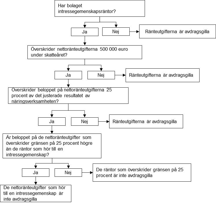 Diagrammet ovan beaktar inte undantaget som grundar sig på en jämförelse av balansräkningar (se punkt 7) eller befrielsen för kredit-, försäkrings- eller pensionsanstalter från begränsningen att dra av ränteutgifter enligt 18 a § i NärSkL (se punkt 2.1.2). I diagrammet avses med intressegemenskapsräntor de ränteutgifter som betalats för intressegemenskapsskulder i enlighet med punkt 3.2.