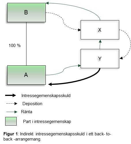 Vid back-to-back-utlåning står parterna i intressegemenskap inte i ett skuldförhållande sinsemellan, men den faktiska förmånstagaren av den inkomst som motsvarar ränteutgift i arrangemanget är dock i intressegemenskap med det bolag som är gäldenär. Av denna anledning utgör back-to-back-skulder sådana intressegemenskapsskulder som avses i bestämmelsen.