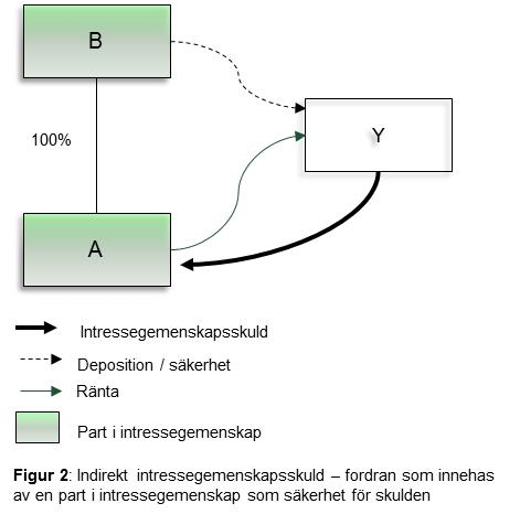- En fordran som innehas av en part i intressegemenskapen utgör säkerhet för skulden (indirekt intressegemenskapsskuld).