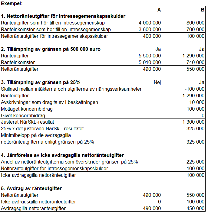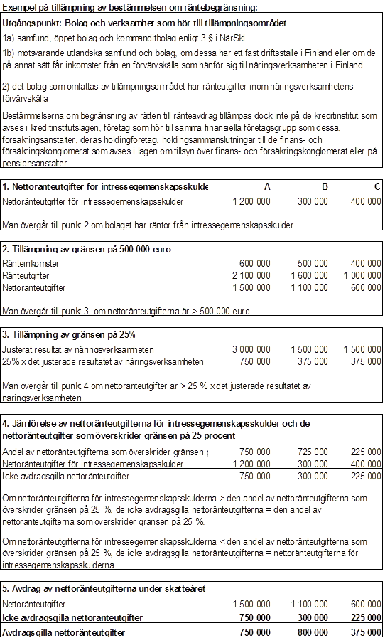 Beräkningen av räntor som inte får dras av baserar sig på skatteårets nettoränteutgifter. Om skatteårets nettoränteutgifter uppgår till högst 500 000 euro, får ränteutgifterna dras av i sin helhet. Begränsningarna av rätten att dra av räntor inverkar i sin helhet på beloppet på nettoränteutgifterna då nettoränteutgifterna överskrider 500 000 euro. I dylika fall fastställs de icke avdragsgilla nettoränteutgifternas andel genom att man först beräknar andelen på 25 procent av det justerade resultatet av näringsverksamheten, och jämför den del av nettoränteutgifterna som överskrider denna gräns med de nettoränteutgifter som betalats för intressegemenskapsskulderna.