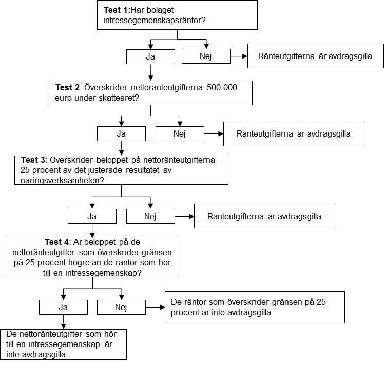 Diagrammet ovan beaktar inte en befrielse som grundar sig på en balansjämförelse (se punkt 7) eller en befrielse för kredit-, försäkrings- eller pensionsanstalter från begränsningen att dra av ränteutgifter enligt 18 a § i NärSkL (se punkt 2.1.2). I diagrammet avses med intressegemenskapsräntor de ränteutgifter som betalats för intressegemenskapsskulder enligt punkt 3.2.