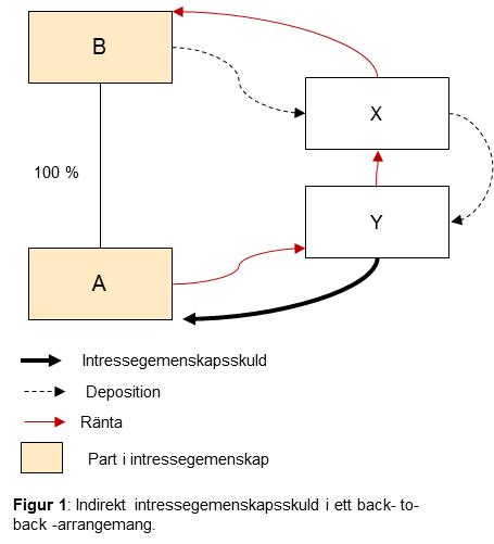 Vid back-to-back-utlåning står parterna i intressegemenskap inte i ett skuldförhållande sinsemellan, men den faktiska förmånstagaren av den inkomst som motsvarar ränteutgift i arrangemanget är dock i intressegemenskap med det bolag som är gäldenär. Av denna anledning utgör back-to-back- skulder sådana intressegemenskapsskulder som avses i bestämmelsen.