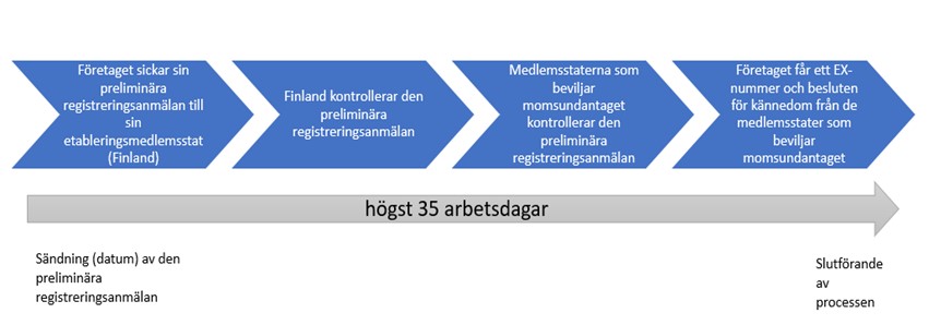 Ett finskt företag börjar tillämpa momsundantaget i en annan medlemsstat enligt den preliminära registreringsanmälan från och med den dag då Skatteförvaltningen meddelar företaget ett EX-nummer. Företaget får i MinSkatt ett separat meddelande om varje beslut från de medlemsstater som beviljat momsundantaget. Meddelandet innehåller information om huruvida medlemsstaten i fråga har beviljat tillämpningen av momsundantaget inom sitt område.