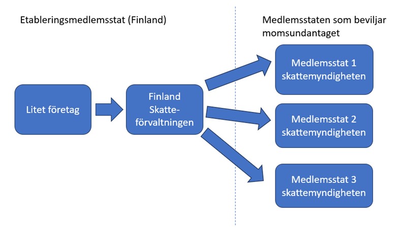 Ett finsk företag anger i sin preliminära registreringsanmälan att det ska tillämpa momsundantaget för små företag i Estland och Sverige. Estland är den första som beviljar momsundantaget och skickar information om det till Finland. Företaget kan börja utöva verksamhet som omfattas av undantaget från momsplikt i Estland när Finland meddelar ett EX-nummer till företaget.