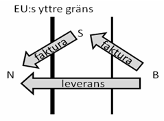 Ett svenskt företag S köper stål från en finsk fabrik B. B levererar stålet enligt köpekontraktet till Norge. Det är inte fråga om gemenskapsintern försäljning, utan momsfri försäljning utanför EU, trots att köparen är ett svenskt företag. Bevisningen av exporten består av Tullens elektroniskt utförselbekräftade överlåtelsebeslut om export av varan där B antecknats som exportör till Norge. S säljer stålet till ett norskt företag N. Försäljningen sker inte i Finland, varför den finska mervärdesskattelagen tillämpas inte på försäljningen.