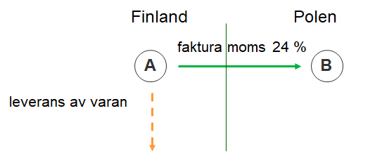 Om varan i exempelfallet skulle vara i Finland då den överlåts till en svensk köpare skulle det vara fråga om försäljning i Finland. I detta fall skulle det finländska företaget fakturera den svenska köparen med en faktura som inkluderar den finländska momsen.