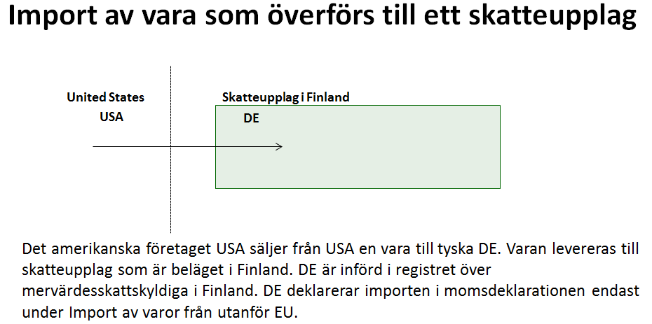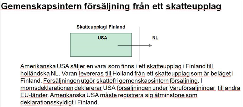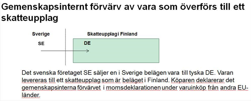 När varan levereras från ett annat EU-land i samband med ett gemenskapsinternt förvärv direkt till ett skatteupplag som är beläget i Finland, ska värdet på gemenskapsförvärven deklareras i momsdeklarationen under Varuinköp från andra EU-länder. Under Skatt på varuinköp från andra EU-länder deklareras ingenting. Om köparen är utländsk, ska han registrera sig minst som deklarationsskyldig i Finland (se exempel 2).