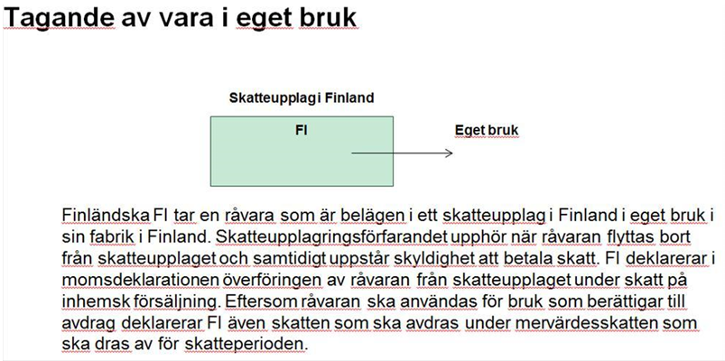 När en näringsidkare t.ex. överför en råvara som finns i ett skatteupplag till sin tillverkningsverksamhet, upphör skatteupplagringsförfarandet och mervärdesskatt ska betalas på överföringen. Mervärdesskatten deklareras i momsdeklarationen under Skatt på inhemsk försäljning enligt skattesats. Om råvaran ska användas av varans ägare i användning som berättigar till avdrag, deklarear ägaren även mervärdesskatten som avdras i punkt Skatt som avdras under skatteperioden (se exempel 6).