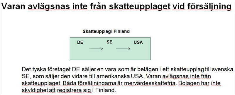 Om överföringen av varor hänför sig till försäljning, import eller överföring till ett land utanför EU, beskattas inte själva överföringen från skatteupplaget. Upphörande av skatteupplagringsförfarandet beskattas då utifrån försäljning eller import av varan eller överföring av varan utanför EU (MomsL 72 l § 2 mom.). Sålunda kan försäljningen av varan vara mervärdesskattefri eller –pliktig. Skattebehandlingen är beroende av vart varan säljs (se exempel 6 och 7).