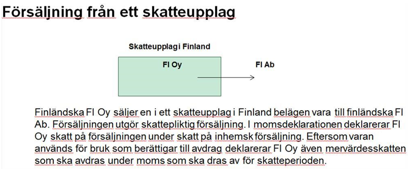 När varan och skatteupplaget befinner sig i Finland ska försäljningen av vara som överförs till skatteupplaget deklareras i momsdeklarationen under Omsättning enligt 0-skattesats. Det är inte av någon betydelse för deklareringen, om köparen är finländsk eller utländsk (se exempel 1).