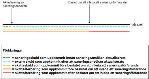 Skatteskulden kan kvittas med skatteåterbäringen när de linjer som beskriver skulden och skatteåterbäringen löper parallellt på tidsaxeln ovan. Ett undantag är användningen av en återbäring som uppkommit efter beslutet om att inleda förfarandet även då det gäller en extern skuld som uppkommit före beslutet om att inleda ett saneringsförfarande.