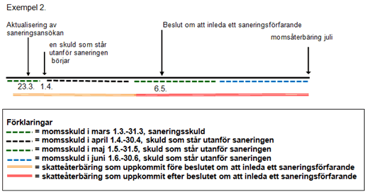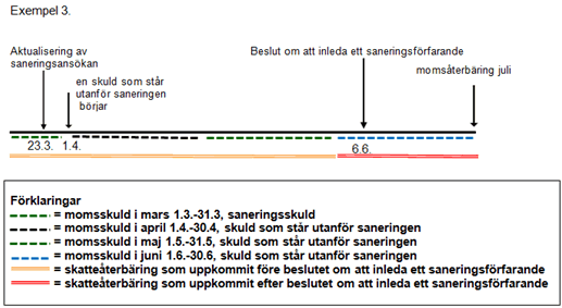 Obs! Om en kreditering hade uppkommit på skattekontot i april, skulle den ha betraktats som en kreditering som uppkommit efter saneringsförfarandet och inte kunnat användas för saneringsskulden. Krediteringen för april skulle delvis hänföra sig till tiden efter beslutet om att inleda ett förfarande, och på grund av skatteperiodens odelbarhet delvis behandlas som en skatteåterbäring som uppkommit efter beslutet om att inleda ett saneringsförfarande.