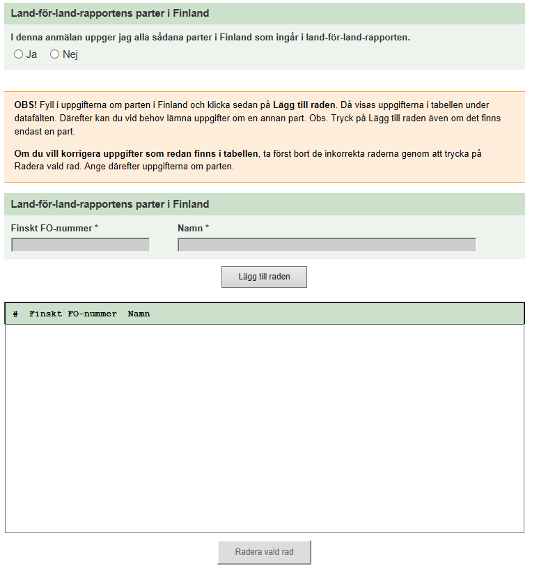 En koncern kan ha flera anmälningsskyldiga i Finland. Nedan nämnda punkt är avsedd för att lätta på anmälningsskyldigheten i en situation där en land-för-land-rapport för beskattningen omfattar fler än en part som finns i Finland. I så fall räcker det att en anmälningsskyldig specificerar alla parter som finns i Finland och omfattas av land-för-land-rapporten. Om svaret på denna punkt är ”Ja” öppnar sig ett fält där alla parter som är belägna i Finland (inkl. anmälaren) bör anges oberoende av deras antal. Om svaret är ”Nej”, innebär det att det finns även andra parter än anmälaren i Finland, men anmälaren ger ingen anmälning för dessa andra parters del.