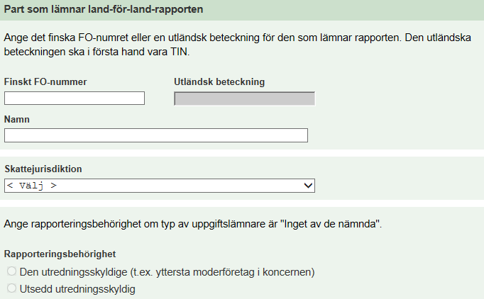 I denna punkt meddelas identifikationsuppgifter om den part som lämnar in den egentliga land-för-land-rapporten. Om rapporten ges till ett annat land än Finland, ska anmälan omfatta det utländska företagets namn, en beteckning (TIN) som motsvarar det finländska FO-numret eller en annan beteckning som identifierar parten i brist på TIN.