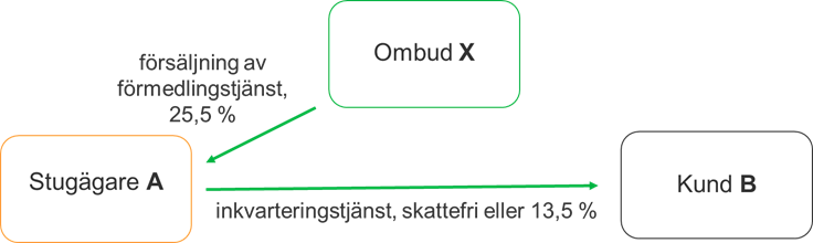 Stugans ägare A överlåter nyttjanderätten till stugan till ombud X. Det kan vara fråga om överlåtelse av nyttjanderätten till fastigheten, varvid hyran kan vara skattefri eller alternativt kan den allmänna skattesatsen vara tillämplig på hyran. Om stugans ägare A däremot inte överlåter den permanenta nyttjanderätten till ombud X för dennes inkvarteringsverksamhet, ska det för stugans ägare A:s del bedömas huruvida det är fråga om inkvarteringsverksamhet eller inte (nedsatt skattesats eller skattefri).
