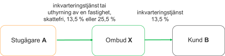 Exempel 1: Stugans ägare A hyr en stuga genom ett ombud (ombud X). Kunderna kontaktar ombudet för att fråga om inkvarteringsmöjligheter i området. Ombud X marknadsför A:s stuga. Ombud X berättar för kunderna att stugans ägare A hyr ut inkvarteringslokalerna. Ombud X tar ut en förmedlingsavgift av stugans ägare A.