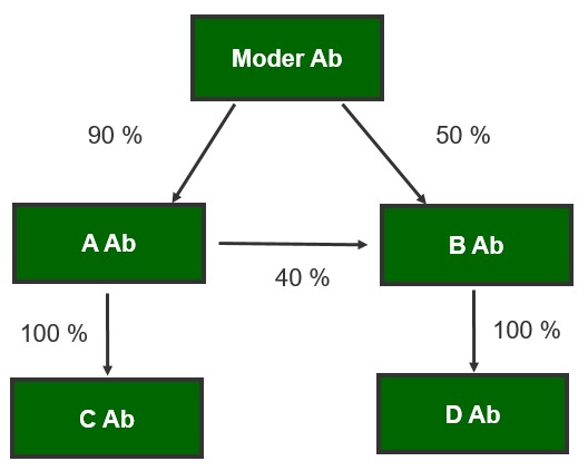 Moder Ab äger 90 % av A Ab:s aktiekapital och 50 % av B Ab:s aktiekapital. Dessutom äger A Ab 40 % av aktiekapitalet i B Ab. A Ab och B Ab har var sitt dotterbolag (C Ab och D Ab) som de äger till 100 %.