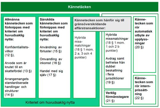 Kriteriet om huvudsaklig nytta är ett förfarande som hänför sig uttryckligen till rapporteringsplikten av arrangemangen. Förutsättningarna för uppfyllandet av kriteriet om huvudsaklig nytta avviker från de nationella bestämmelserna om kringgående av skatt (t.ex. BFL 28, BFL 52 h §) och den allmänna bestämmelsen om kringgående av skatt vad gäller skatteavtal (test av det huvudsakliga syftet, Principal Purpose Test, OECD Action 6 BEPS i artikel 29 (9) i år 2017 version av OECD:s modellskatteavtal). Förutsättningarna för kriteriet om huvudsaklig nytta kan uppfyllas även om tillämpningsförutsättningarna för de ovannämnda bestämmelserna om kringgående av skatt inte skulle uppfyllas.