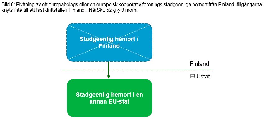 Med flyttning av stadgeenlig hemort anses enligt NärSkL 52 g § 1 mom. en transaktion varigenom ett europabolag eller en europeisk kooperativ förening utan att det medför bolagets avveckling eller bildandet av en ny juridisk person flyttar sin stadgeenliga hemort från en medlemsstat till en annan medlemsstat. Enligt NärSkL 52 g § 2 mom. dras anskaffningsutgifter och andra utgifter som inte dragits av vid beskattningen av ett europabolag eller en europeiska kooperativ förening som flyttat sin stadgeenliga hemort från Finland till en annan medlemsstat av, till den del de faktiskt knyts till ett fast driftställe som bildas i Finland, på samma sätt som de skulle ha dragits av om den stadgeenliga hemorten inte hade flyttats. Reserver och korrigeringsposter som hänför sig till det fasta driftstället räknas också som skattepliktig inkomst på samma sätt som de skulle ha räknats som inkomst om hemorten inte hade flyttats. Vid beskattningen av det fasta driftstället avdras europabolagets eller den europeiska kooperativa föreningens fastställda förluster för tidigare år som inte dragits av på samma sätt som de skulle ha dragits av om hemorten inte hade flyttats.