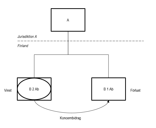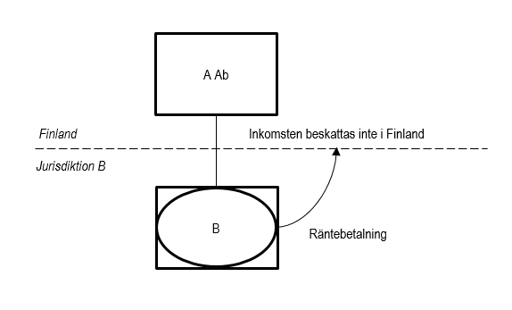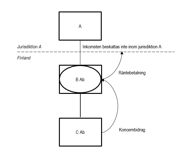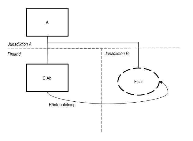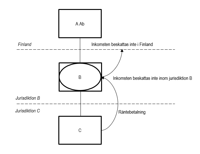 Det finska bolaget C Ab är dotterbolag i koncernen A, som omfattar de inom olika jurisdiktioner utanför EU belägna moderbolaget A och ett annat dotterbolag B. B drar i sin beskattning av ränta som B har betalat till A. Betalningen leder till en i hybridbestämmelserna avsedd hybrid missmatchning, eftersom det inom jurisdiktion A anses att betalningen på grund av villkoren för låneinstrumentet är skattefri vinstutdelning. Inom jurisdiktionerna A och B tillämpas inte de på OECD-rapporterna baserade bestämmelserna som motsvarar bestämmelserna i direktivet om eliminering av hybridarrangemang. Det finska bolaget tar ett lån av B och betalar utgående från detta ränta till B. Ränteinkomsten inkluderas i B:s skattebas. Det finska bolagets inkomst som motsvarar ränteutgiften kvittas i denna situation direkt mot det skattemässiga resultat som uppkommer vid hybridarrangemanget. Bestämmelsen om kvittning tillämpas i Finland. C Ab:s rätt att dra av ränteutgiften begränsas med stöd av 8 § 1 mom. i hybridlagen.