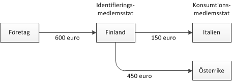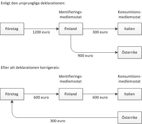 Ett företag har deklarerat att skattebeloppet på försäljningen uppgår till 1200 euro, av vilket 300 euro hör till Italien och 900 euro till Österrike. Företaget har betalat 1200 euro till identifieringsmedlemsstaten Finland före förfallodagen och betalningen har förmedlats till konsumtionsmedlemsstaten. Senare framgår det att deklarationsuppgifterna är felaktiga och företaget korrigerar sin deklaration.