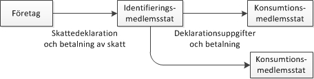 Identifieringsmedlemsstaten är det EU-land där näringsidkaren registrerar sig som användare av den särskilda ordningen, lämnar in skattedeklarationer och betalar skatt. Identifieringsmedlemsstaten förmedlar deklarationsuppgifter och betalningar till konsumtionsmedlemsstaterna. Beskattningsförfarandet för försäljningar i identifieringsmedlemsstaten behandlas i kapitlen 3.1.1–3.1.3 och 5.