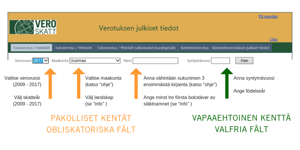 Om du exempelvis söker en fysisk persons offentliga beskattningsuppgifter på en kundterminal, ange de tre obligatoriska uppgifterna i sökfältet: skatteåret, landskapet och minst de tre första bokstäverna i släktnamnet.