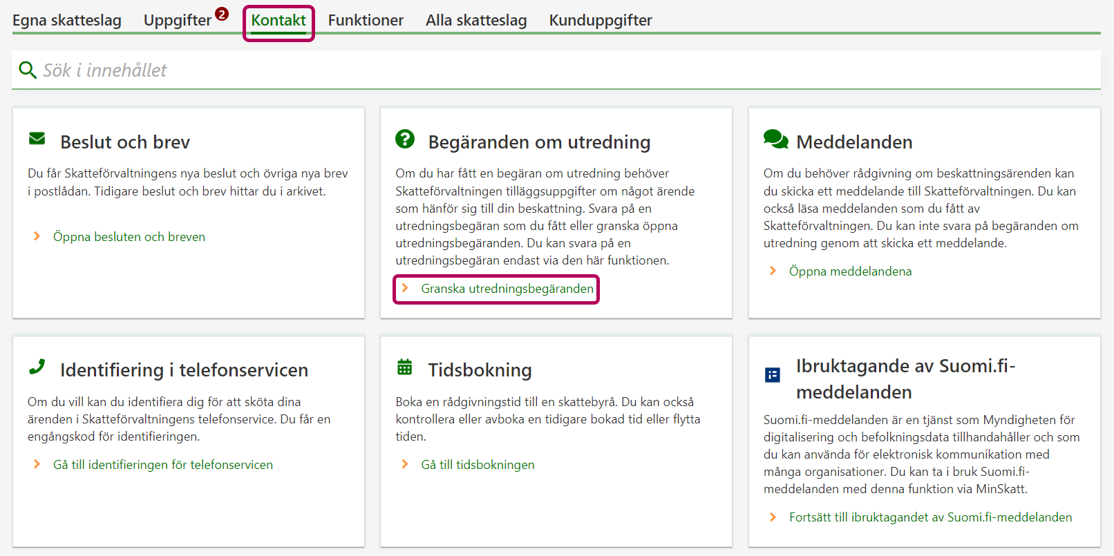 Om du har fått en utredningsbegäran hittar du den på fliken Kontakt. På samma flik hittar du också andra inkomna beslut och brev. Välj länken Granska utredningsbegäranden i punkten Begäranden om utredning.