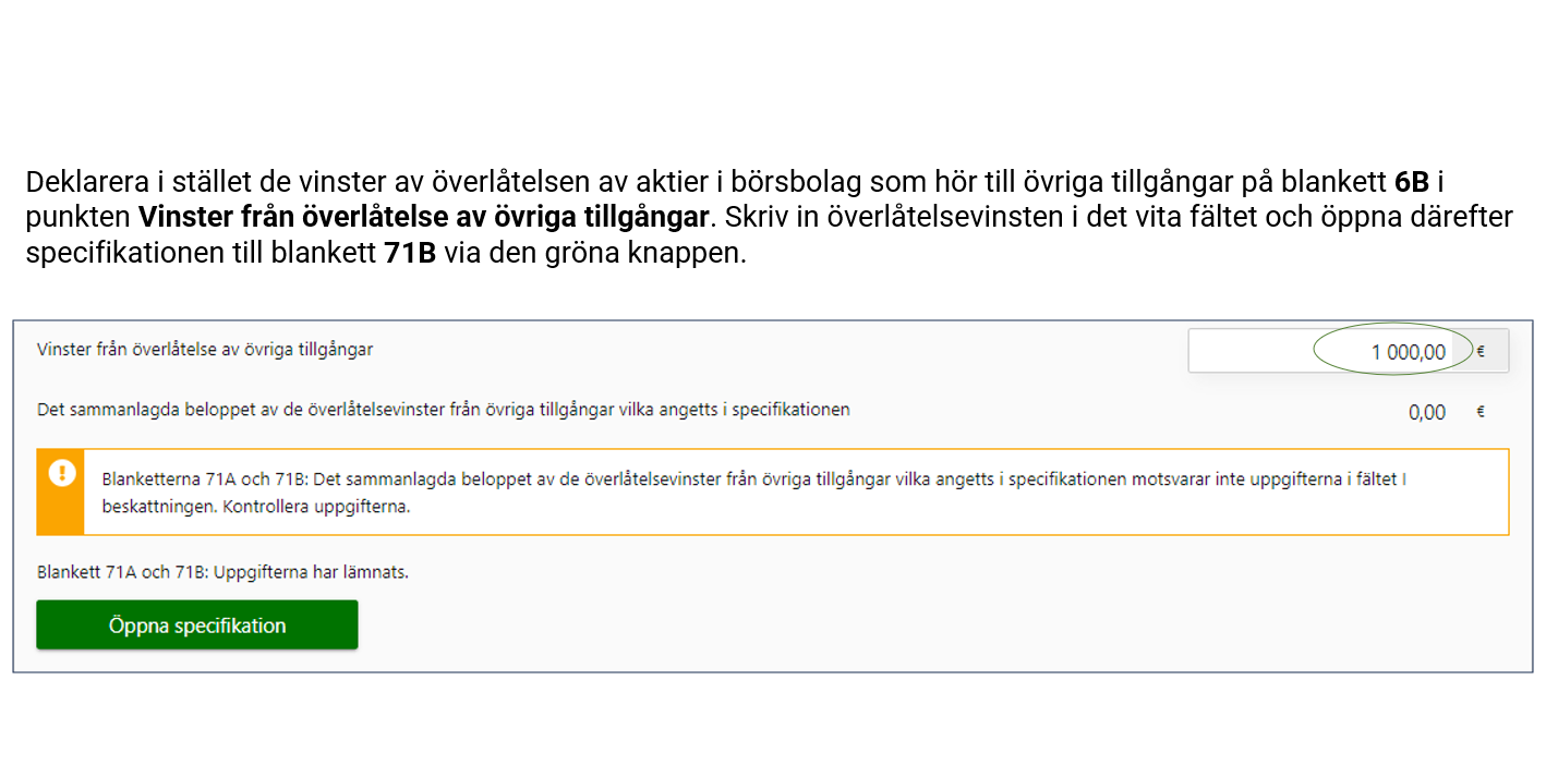 Deklarera i stället de vinster av överlåtelsen av aktier i börsbolag som hör till övriga tillgångar på blankett 6B i punkten Vinster från överlåtelse av övriga tillgångar. Skriv in överlåtelsevinsten i det vita fältet och öppna därefter specifikationen till blankett 71B via den gröna knappen.