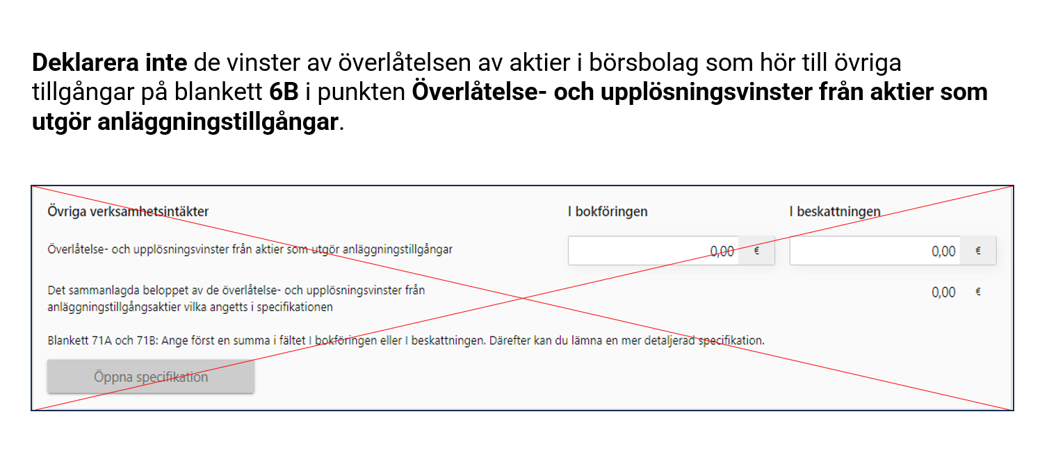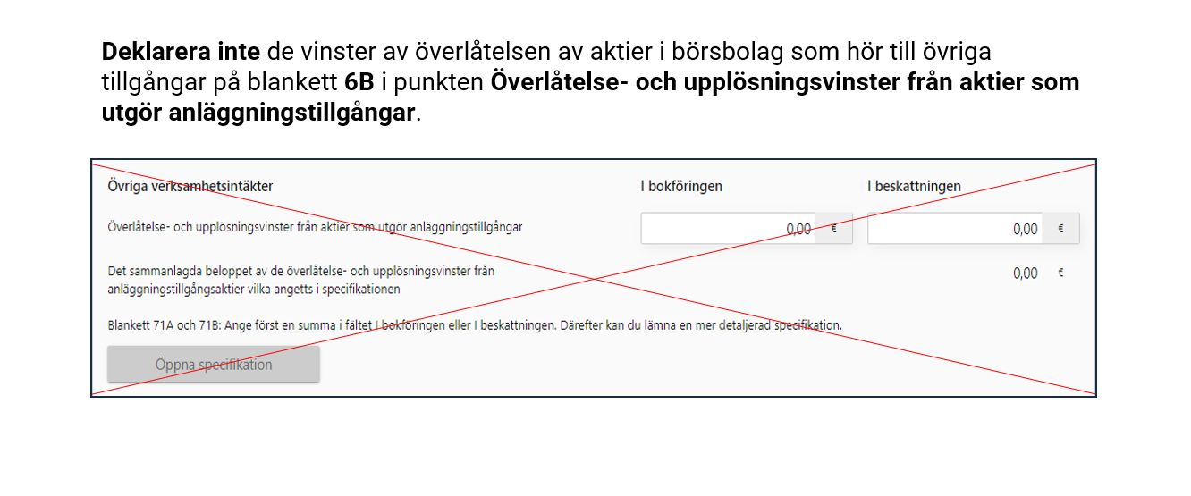 Deklarera inte de vinster av överlåtelsen av aktier i börsbolag som hör till övriga tillgångar på blankett 6B i punkten Överlåtelse- och upplösningsvinster från aktier som utgör anläggningstillgångar.