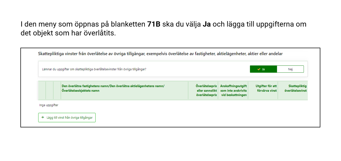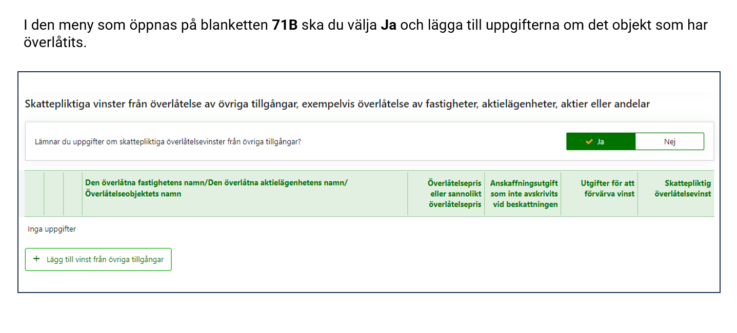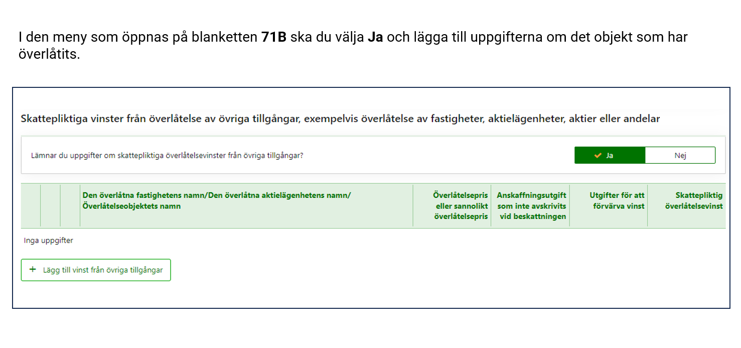 I den meny som öppnas på blanketten 71B ska du välja Ja och lägga till uppgifterna om det objekt som har överlåtits.