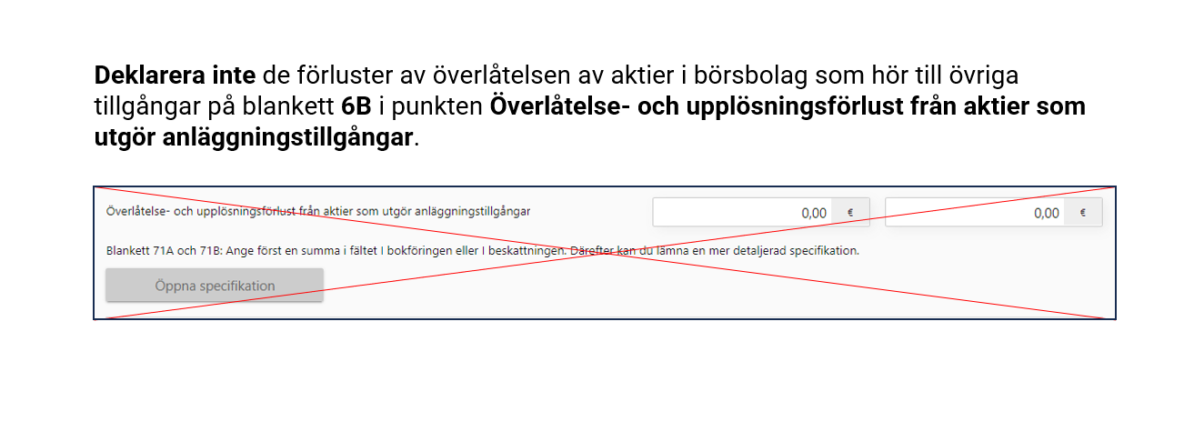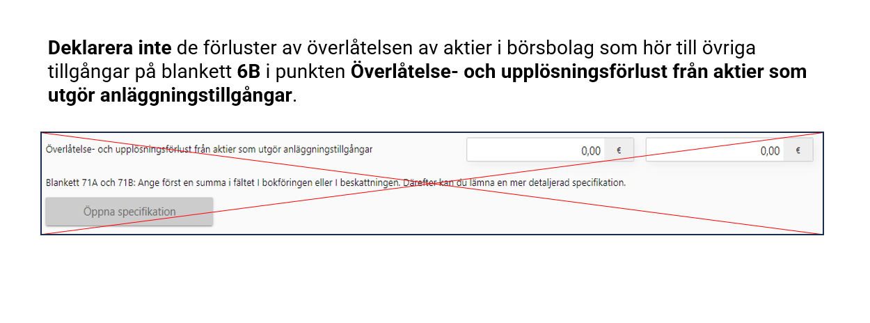 Deklarera inte de förluster av överlåtelsen av aktier i börsbolag som hör till övriga tillgångar på blankett 6B i punkten Överlåtelse- och upplösningsförlust från aktier som utgör anläggningstillgångar.