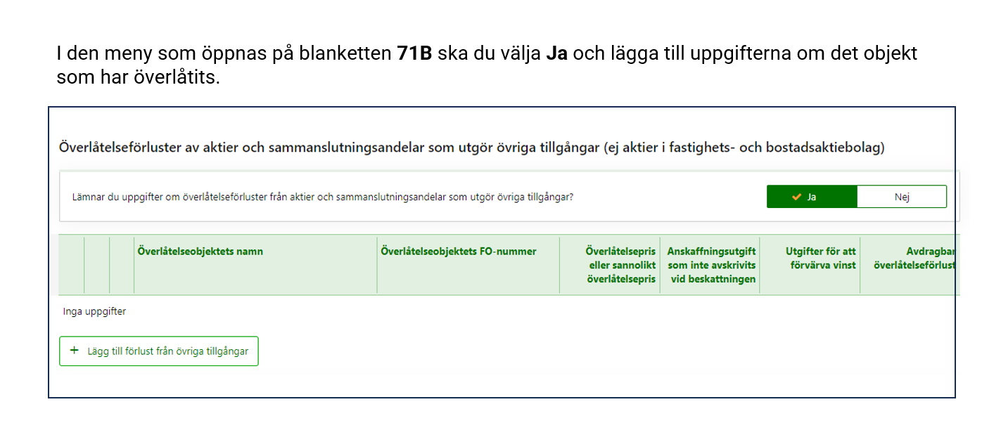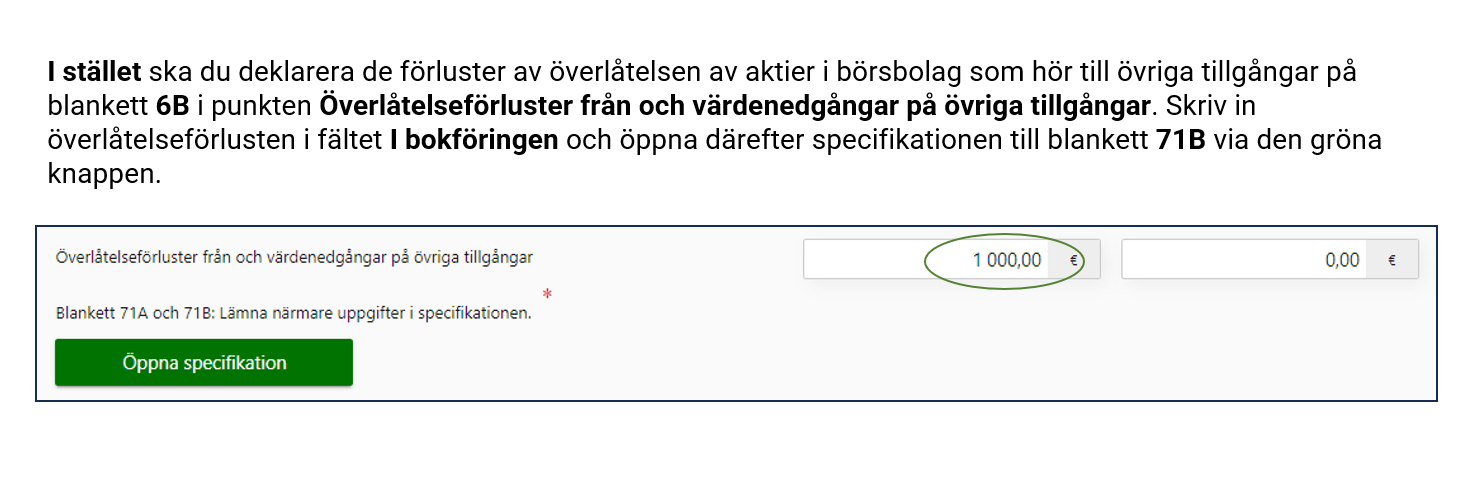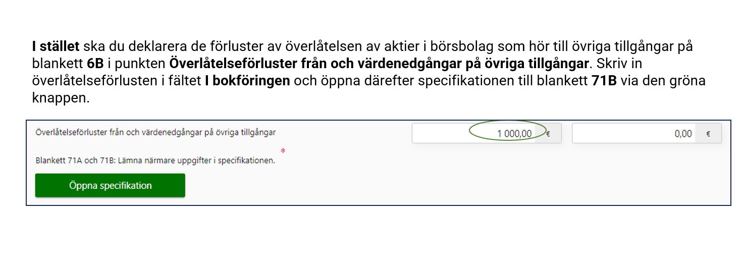 I stället ska du deklarera de förluster av överlåtelsen av aktier i börsbolag som hör till övriga tillgångar på blankett 6B i punkten Överlåtelseförluster från och värdenedgångar på övriga tillgångar. Skriv in överlåtelseförlusten i fältet I bokföringen och öppna därefter specifikationen till blankett 71B via den gröna knappen.