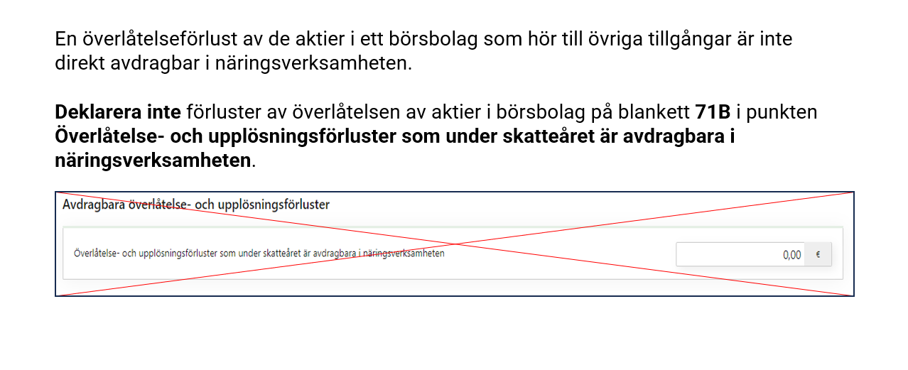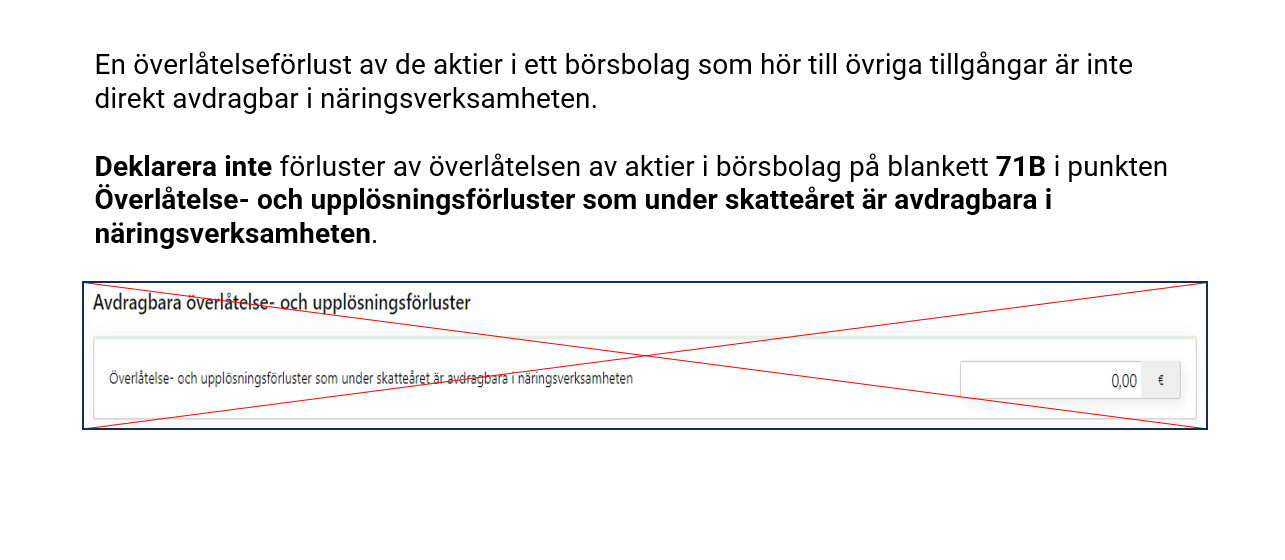 Deklarera inte förluster av överlåtelsen av aktier i börsbolag på blankett 71B i punkten Överlåtelse- och upplösningsförluster som under skatteåret är avdragbara i näringsverksamheten.