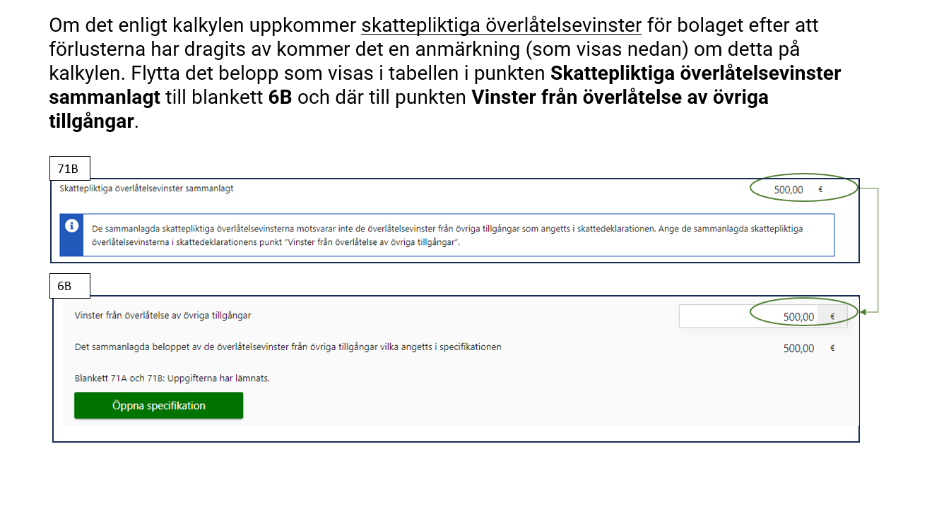 Om det enligt kalkylen uppkommer skattepliktiga överlåtelsevinster för bolaget efter att förlusterna har dragits av kommer det en anmärkning (som visas nedan) om detta på kalkylen. Flytta det belopp som visas i tabellen i punkten Skattepliktiga överlåtelsevinster sammanlagt till blankett 6B och där till punkten Vinster från överlåtelse av övriga tillgångar.