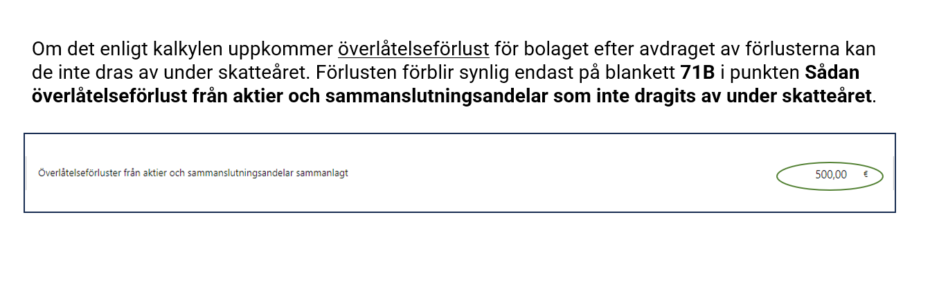 Om det enligt kalkylen uppkommer överlåtelseförlust för bolaget efter avdraget av förlusterna kan de inte dras av under skatteåret. Förlusten förblir synlig endast på blankett 71B i punkten Sådan överlåtelseförlust från aktier och sammanslutningsandelar som inte dragits av under skatteåret.