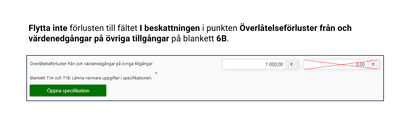 Flytta inte heller förluster till fältet I beskattningen i punkten Överlåtelseförluster från och värdenedgångar på övriga tillgångar på blankett 6B.