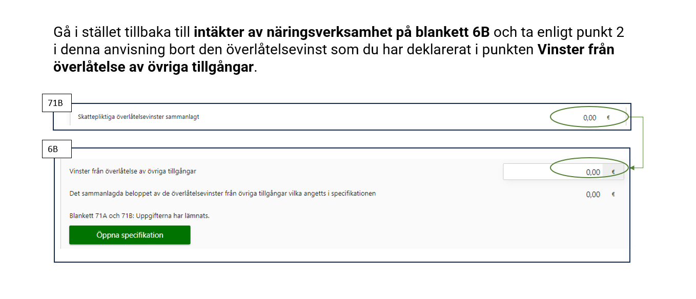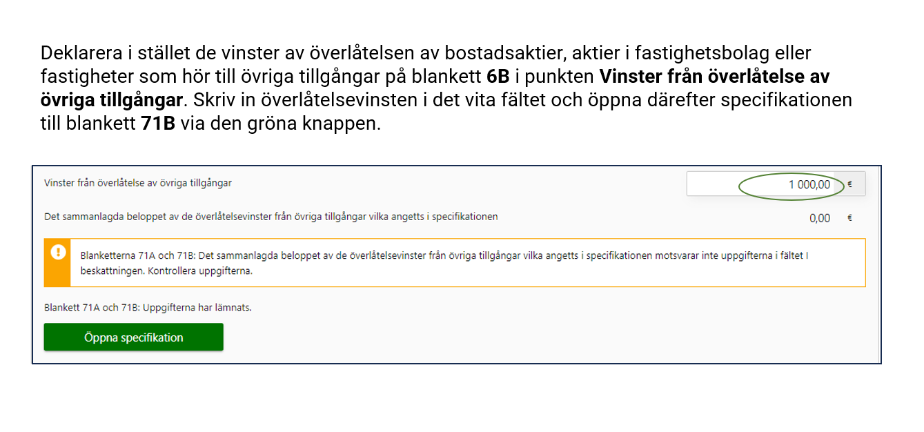 Deklarera i stället de vinster av överlåtelsen av bostadsaktier, aktier i fastighetsbolag eller fastigheter som hör till övriga tillgångar på blankett 6B i punkten Vinster från överlåtelse av övriga tillgångar. Skriv in överlåtelsevinsten i det vita fältet och öppna därefter specifikationen till blankett 71B via den gröna knappen.