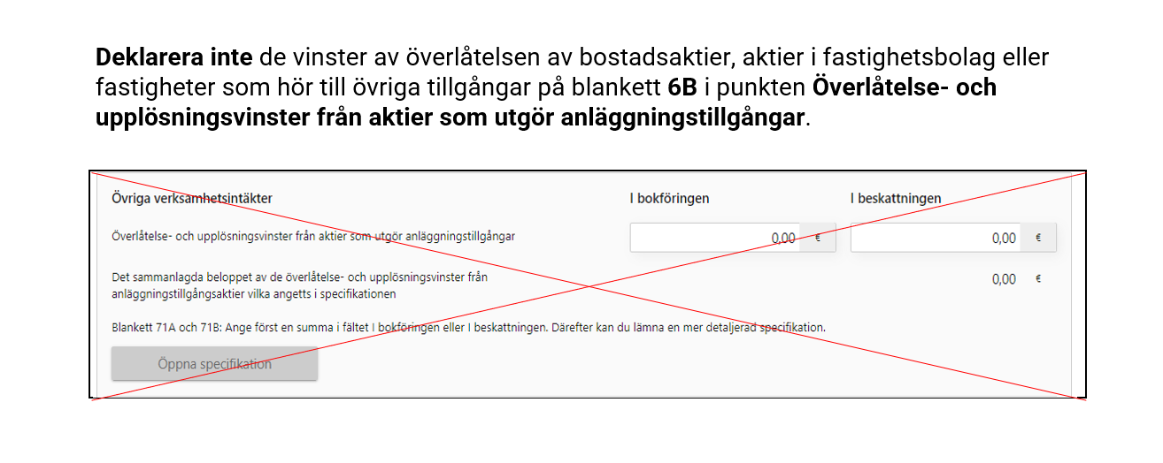 Deklarera inte de vinster av överlåtelsen av bostadsaktier, aktier i fastighetsbolag eller fastigheter som hör till övriga tillgångar på blankett 6B i punkten Överlåtelse- och upplösningsvinster från aktier som utgör anläggningstillgångar.