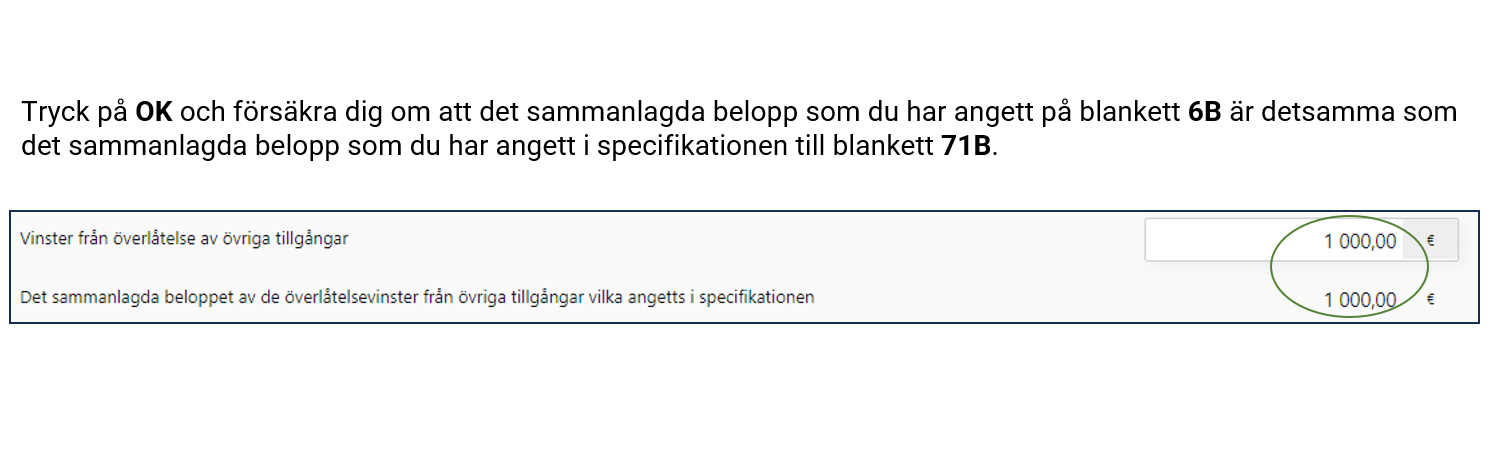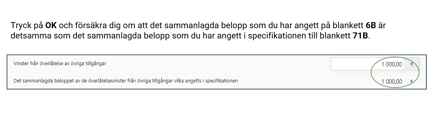 Tryck på OK och försäkra dig om att det sammanlagda belopp som du har angett på blankett 6B är detsamma som det sammanlagda belopp som du har angett i specifikationen till blankett 71B.