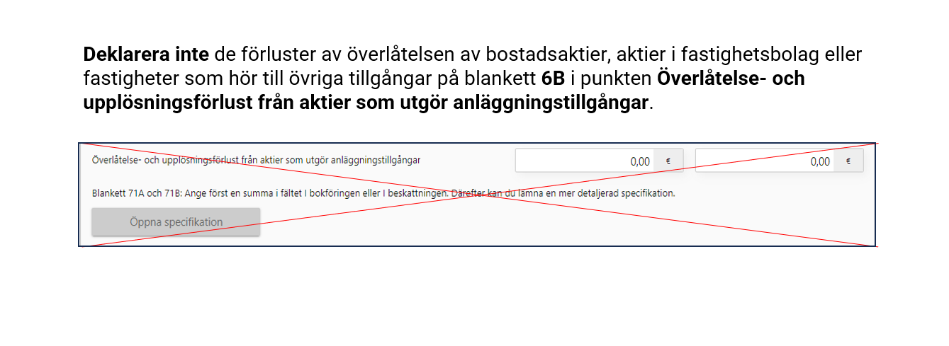 Deklarera inte de förluster av överlåtelsen av bostadsaktier, aktier i fastighetsbolag eller fastigheter som hör till övriga tillgångar på blankett 6B i punkten Överlåtelse- och upplösningsförlust från aktier som utgör anläggningstillgångar.