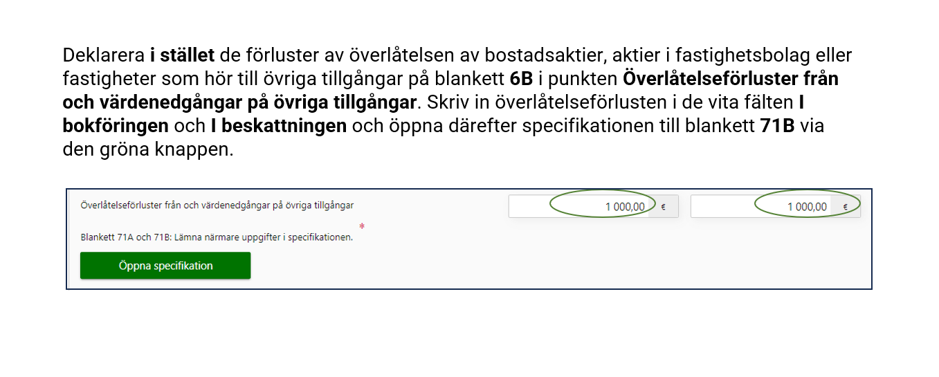 Deklarera i stället de förluster av överlåtelsen av bostadsaktier, aktier i fastighetsbolag eller fastigheter som hör till övriga tillgångar på blankett 6B i punkten Överlåtelseförluster från och värdenedgångar på övriga tillgångar. Skriv in överlåtelseförlusten i de vita fälten I bokföringen och I beskattningen och öppna därefter specifikationen till blankett 71B via den gröna knappen.