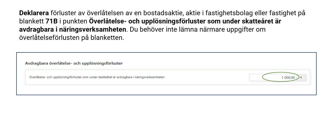 Deklarera förluster av överlåtelsen av en bostadsaktie, aktie i fastighetsbolag eller fastighet på blankett 71B i punkten Överlåtelse- och upplösningsförluster som under skatteåret är avdragbara i näringsverksamheten. Du behöver inte lämna närmare uppgifter om överlåtelseförlusten på blanketten.