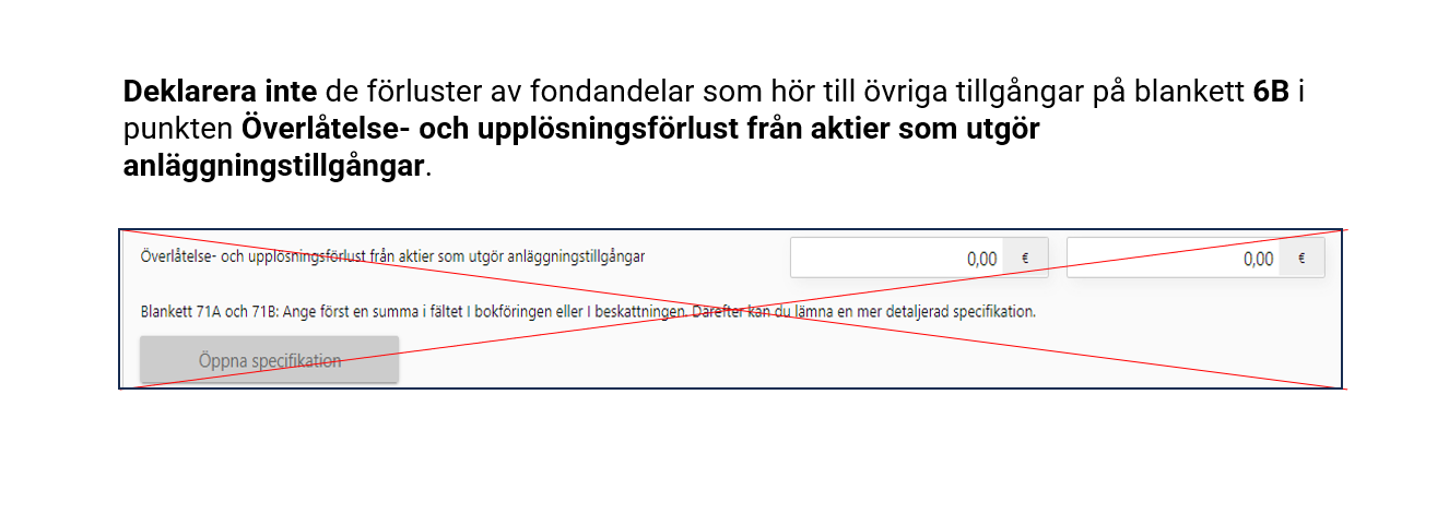Deklarera inte de förluster av fondandelar som hör till övriga tillgångar på blankett 6B i punkten Överlåtelse- och upplösningsförlust från aktier som utgör anläggningstillgångar.